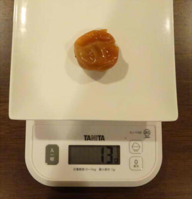 梅干し1個の重さですが、以下は普通サイズの梅干しで13g、種を除いた果肉だけだと10gですね。