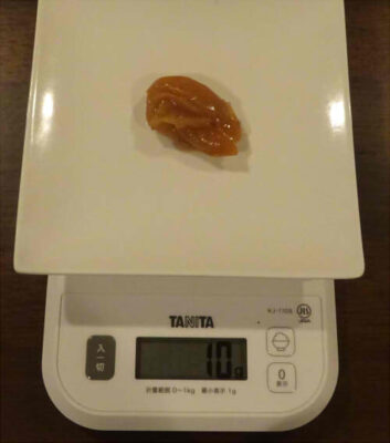 13gの梅干しならうち3.25gが廃棄部分(種)になるので、計算だと9.75gとなります。